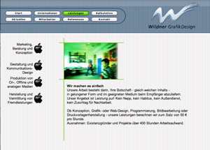 Die Startseite unseres ersten Internetauftritts bietet einen schnellen Überblick über die komplette Seite und versucht durch witzige Einklinker zu überzeugen. Vor die Startseite ist eine Flash-Animation geschaltet, in welcher sich das Logo von Wildner GrafikDesign aufbaut. Für farbige Akzente sorgen kleine Bilder aus der Agentur im Footer der Seite. Unsere erste Seite ist links oben im Browserfenster ausgerichtet und auf Monitore mit der gängigen Auflösung 800 x 600 px optimiert.