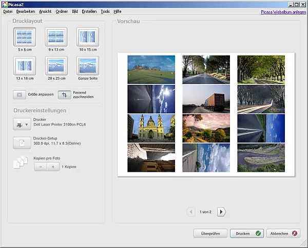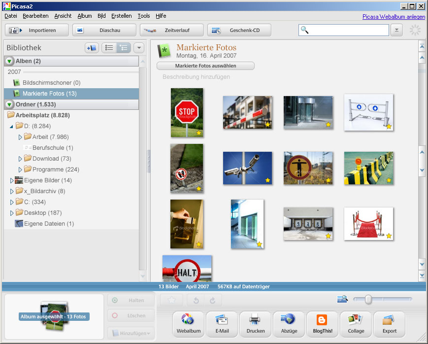 Nach dem ersten Programmstart bietet Picasa an, den Computer nach Bildern zu durchsuchen. Alle gefundenen Bilder werden nach Änderungsdatum sortiert und mit ihrem zugehörigen Ordner angezeigt.