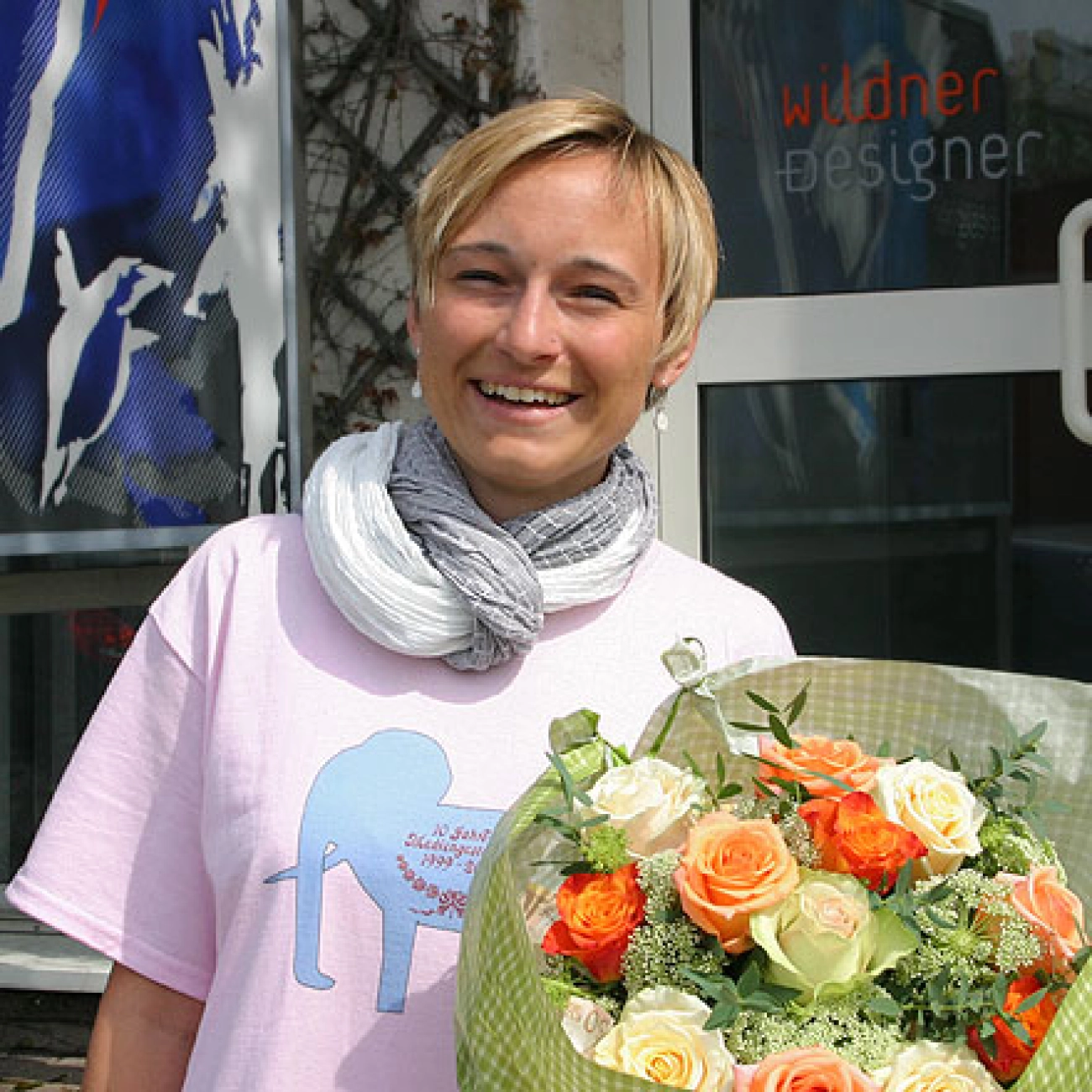 An ihrem Jubiläumstag wurde Kathrin Hain ein rosa T-Shirt mit ihrem blauen Elefanten überreicht.