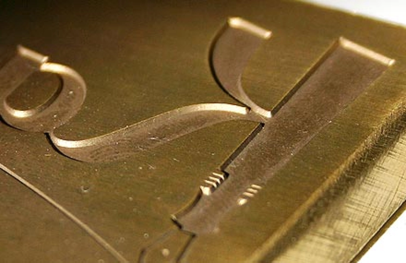 In Handarbeit gefräster Messingprägestempel für plastisches Relief mit weichen Rundungen in der Folienfläche