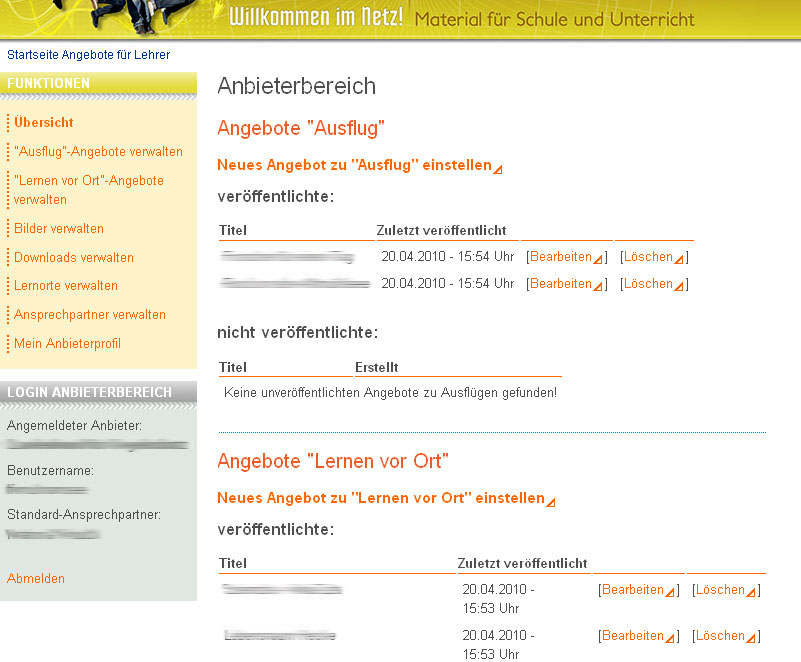 Über den Anbieterbereich ist es möglich, Angebote zu vordefinierten Kategorien einzustellen, ohne sich in das Content Management System einzuloggen. Zudem haben die Anbieter die Möglichkeit, eine eigene Sammlung von Abbildungen, Lernort- und Ansprechpartner-Daten anzulegen.
