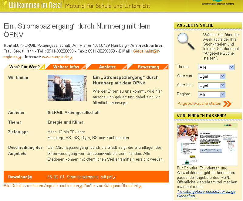 Die Angebote werden auf dem Internet-Portal, getrennt nach den Zielgruppen Schüler, Lehrer und Eltern, angezeigt. Um passende Angebote auszuwählen, können Besucher nach weiteren Kriterien filtern, wie z. B. nach Thema, Altersempfehlung oder der Region. Die Detail-Informationen zu den Angeboten werden in einer festen Struktur dargestellt. Entsprechende Registerkarten sorgen für Übersicht und vermeiden lange Scrollwege. Jedes Angebot wird automatisch mit den folgenden Zusatz-Informationen verknüpft: