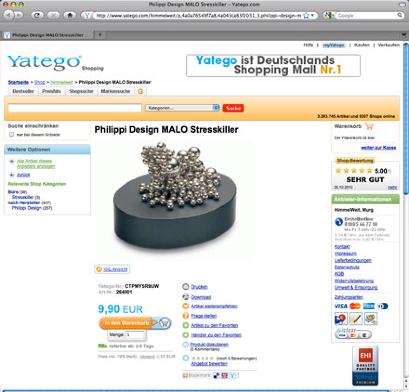 „Stresskiller in ansprechendem Design“ Aus verschieden großen Stahlkugeln die auf einem magnetischen Sockel haften besteht der Philippi Design MALO Stresskiller. Die 200 Stahlkugeln lassen sich beliebig platzieren und helfen bei langwierigen Telefonaten die Ruhe zu bewahren. 25. Oktober 2010 Gestaltungsmöglichkeiten: keine Angaben! Maße und Gewicht: 9 cm Preis und Bestellmengen: 9,90 EUR inkl. MwSt. , zzgl. 2,50 EUR Versand Entdeckt auf: http://www.yatego.com Directlink zurück zur Übersicht Alle Angaben ohne Gewähr!