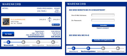 Das System der Sparkassen-Internetkasse deckt dabei die direkte Zahlungsmöglichkeit für Kreditkarte und giropay ab. PayPal ist für Benutzer mit einem bestehenden Konto mit allen Funktionen zur Zahlung via Bankeinzug, Kreditkarte und giropay ausgestattet. Als weitere Option bietet der M+S Shop die Zahlung auf Rechnung. Diese wird über den Anbieter „paymorrow“ abgewickelt und enthält einen Zahlungsschutz für den Käufer und für den Verkäufer. Mit dem Zahlungsvorgang findet eine Liquiditätsprüfung statt. Fällt diese negativ aus, wird der Käufer zurück zur Shopseite geleitet und kann eine der anderen Zahlungsmethoden wählen.