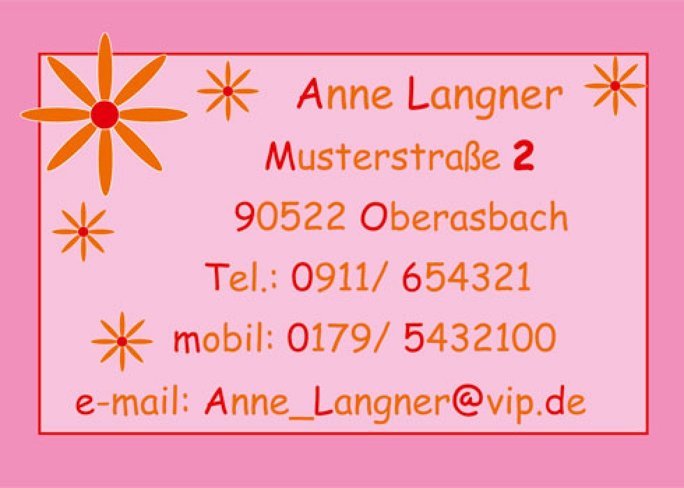 Als Frühwerke konnten wir aus unserem Archiv jedoch Entwürfe zu persönlichen Visitenkarten finden, welche gegen die Mittagszeit des 3. Mai 2002 abgespeichert wurden. Da uns nicht nur ihre gestalterischen Fähigkeiten, sondern auch ihre Sorgfalt und ihr hohes Engagement überzeugten, erhielt Anne Langner bereits zum 1. Juni 2002 einen Ausbildungsvertrag.