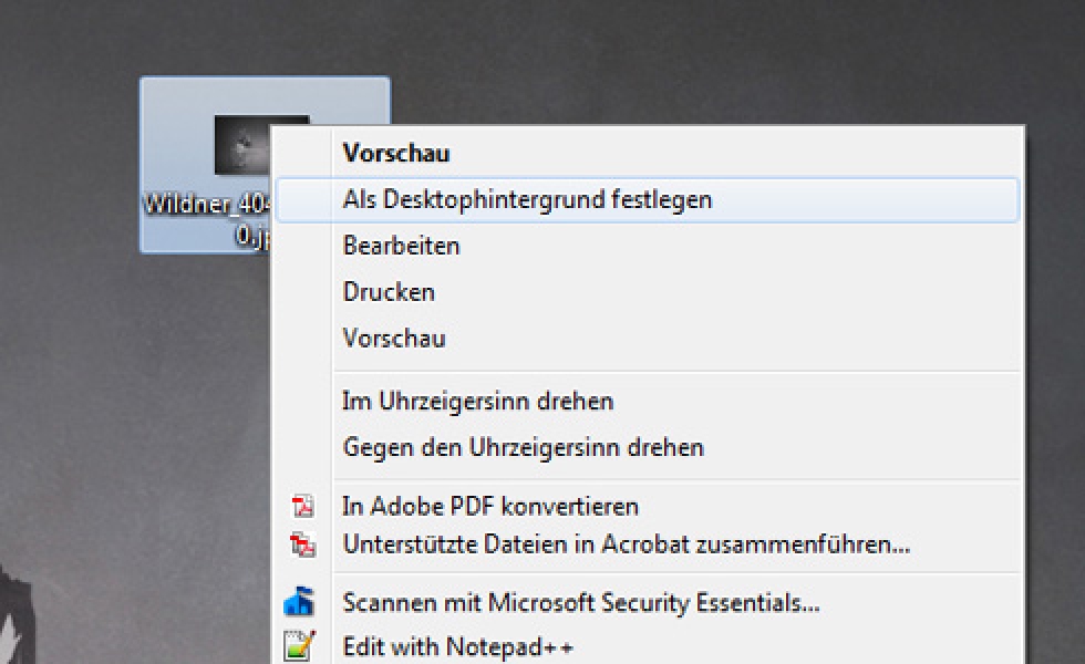 Abschließend klicken Sie die auf Ihrem Rechner gespeicherte Bilddatei mit der rechten Maustaste an und wählen aus dem Kontextmenü "Als Desktophintergrund festlegen" aus.