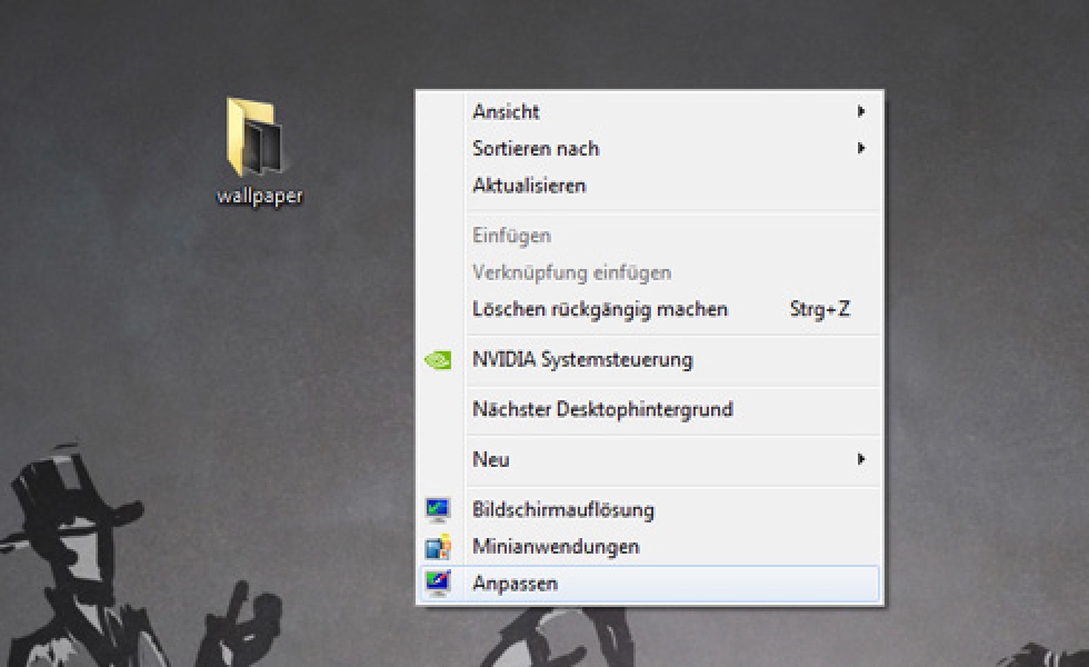 Bevor Sie die Slideshow einrichten können, müssen Sie an einem geeigneten Platz auf Ihrer Festplatte einen Ordner erstellen, in welchen Sie die gewünschten Wallpaper einfügen. Anschließend klicken Sie mit der rechten Maustaste auf Ihren Desktop und wählen aus dem Kontextmenü "Anpassen" aus (Bild 1).