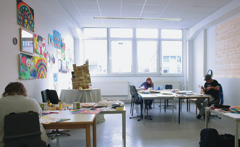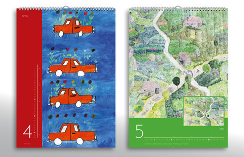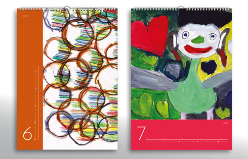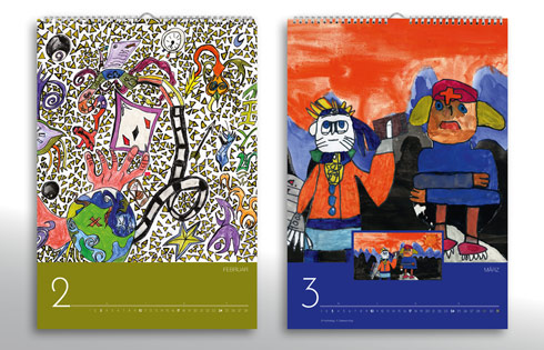 Nun also arbeiteten wir mit der Gruppe Kunstraum der Pegnitz Werkstätten (Lebenshilfe Nürnberg) zusammen. Die Künstler dieser Gruppe stellten die Motive, aus denen Wildner+Designer einen Kunstkalender gestalten würde. Zusätzlich nahmen wir die Druckerei flyermeyer.de mit ins Boot, die die hochwertige Produktion und termingetreue Anlieferung der versandfertigen Kalender gewährleisten sollte.
