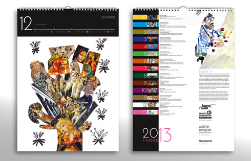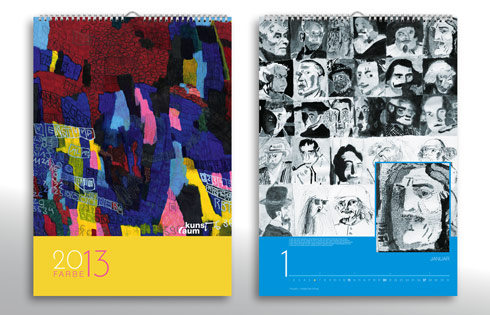 Bei den Überlegungen zum Titel kamen wir auf "Farbe 13". Zum einen ist die 13 eine Anspielung auf das Jahr 2013, zum anderen beschreibt sie die 13 Farben, die wir pro Monat – inklusive Cover – anlegten. Auf der letzten Seite griffen wir nochmals alle Farben in chronologischer Reihenfolge und in Streifenform auf um die Kalendermotive ihren jeweiligen Künstlern und Bezeichnungen zuzuordnen. Zusätzlich verfassten wir für diese Seite einen Informationstext über die Gruppe Kunstraum und unsere Zusammenarbeit, auf der dieser Kalender basiert.