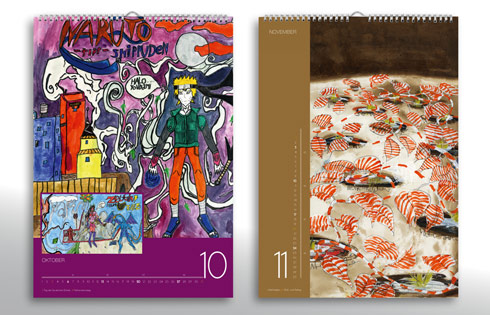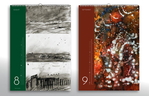 Nach reichlicher Überlegung entschieden wir uns für das Hochformat A2, um die Kalendermotive möglichst gut zur Geltung kommen zu lassen. Schließlich handelt es sich um einen Kunstkalender. Auf 14 einseitig bedruckten Blättern sollten das Cover, die 12 Monate und eine Informationsseite erfasst werden.
