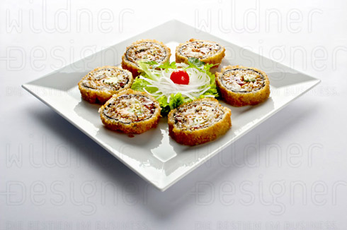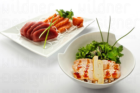 Als Inspiration und Anhaltspunkt zur Gestaltung dienten gelungene Aufnahmen aus dem Web. Durch eine Analyse dieser Bilder konnte das Set für das Shooting im Mini-Fotostudio von Wildner+Designer perfekt vorbereitet werden. Für Testaufnahmen erhielten wir vorab ein paar kleine Portionen über den Standard-Lieferservice. Zum Shooting für die gesamte Speisekarte rückte XINH mit zwei Köchen, den vorgefertigten Speisen, Garnitur und Geschirr an.