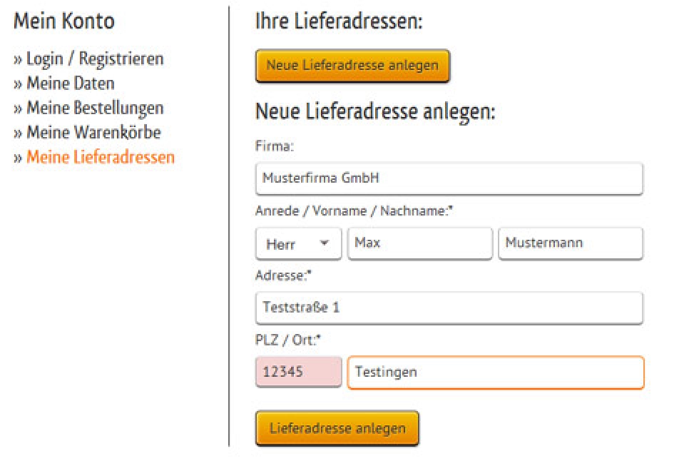 Liegt die Adresse des Kunden nicht im Liefergebiet, oder ist der Kunde unter seiner Rechnungsadresse nicht erreichbar, hat der Kunde die Möglichkeit in seinem Kundenbereich oder direkt während des Bestellvorgangs eine gesonderte Lieferadresse anzugeben. Die angegebenen Lieferadressen werden im Kundenkonto gespeichert und stehen damit auch für weitere Bestellungen zur Auswahl.