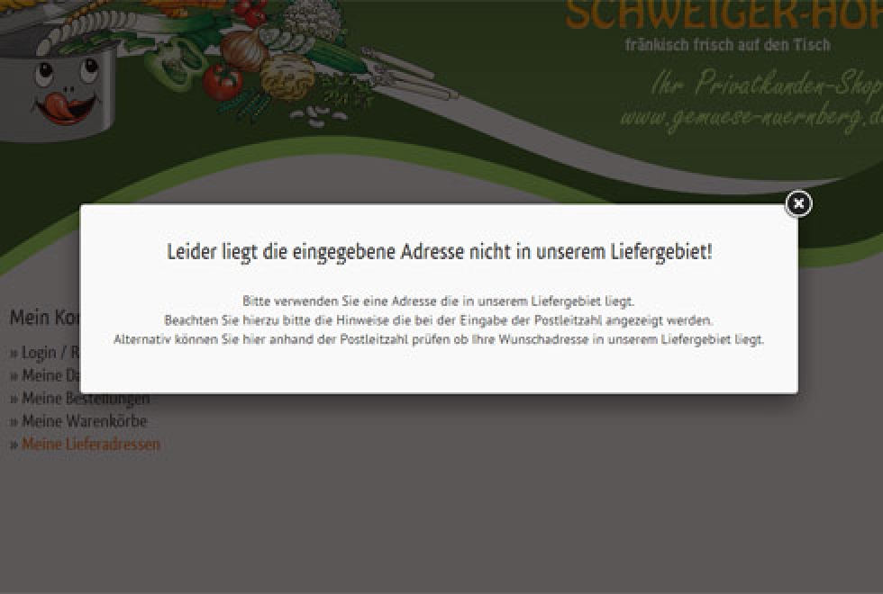Wegen des, aufgrund der Verderblichkeit der verkauften Waren, begrenzten Liefergebiets war für den Privatkunden-Shop eine Lieferadressen-Prüfung anhand Postleitzahlen ein wichtiges Anliegen. Noch vor der Erstellung eines Kundenkontos, kann der Kunde über ein Formular auf der Startseite prüfen ob seine Postleitzahl innerhalb des Liefergebiets liegt. Zusätzlich wird im Registrierungsformular und beim Anlegen von Lieferadressen die Postleitzahl geprüft, so dass der Kunde sofort informiert wird, wenn er eine Adresse eingibt die nicht beliefert werden kann.