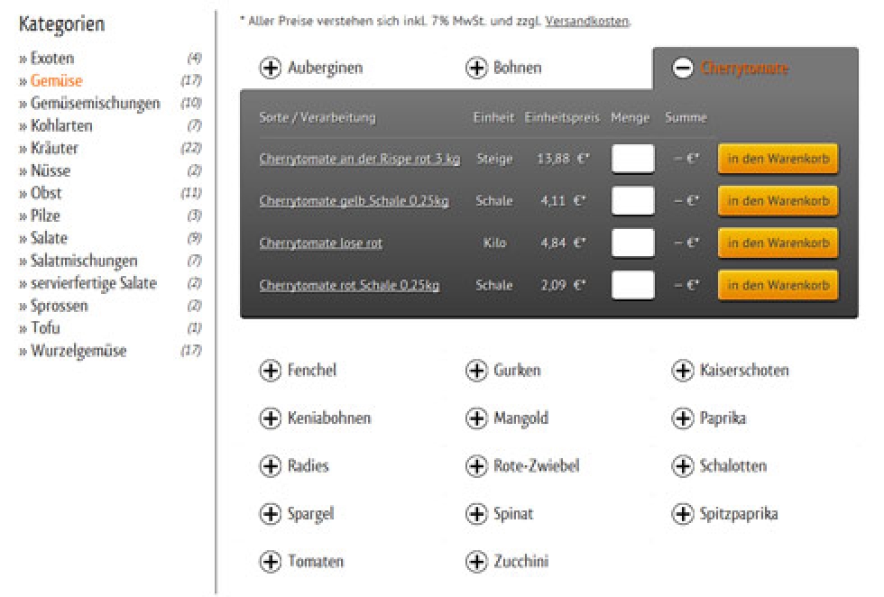 Das Design der beiden Shops ist stark angelehnt an das Design der bereits bestehenden Unternehmens-Seite. Die Grün-Orange Farbgebung wirkt frisch und appetitanregend. Moderne Designelemente wie abgerundete Ecken, Farbverläufe und Schatten wurden mit Hilfe moderner Webtechnologien direkt in HTML und CSS umgesetzt. Dadurch konnten zum einen die Ladezeit und das übertragene Datenvolumen optimiert werden, zum anderen wurde der Pflegeaufwand reduziert, da bei Änderungen und Ergänzungen nun keine Grafiken mehr erstellt, hochgeladen und separat eingebunden werden müssen. Die eingebundenen Webfonts funktionieren browser- und plattformübergreifend, bieten große typografische Freiheit und verleihen dem Design zusätzlich Klasse und einen frischen, modernen Look.