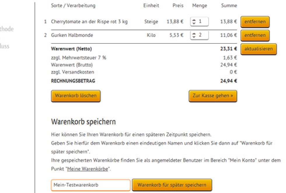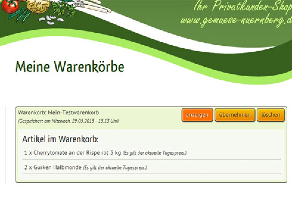 Für regelmäßige Bestellungen oder spätere Einkäufe können Warenkörbe im Benutzerkonto gespeichert werden. Dem gleichen Zweck dient die Bestellhistorie, über die vergangene Bestellungen eingesehen werden können. Der Inhalt gespeicherter Warenkörbe oder vergangener Bestellungen kann dann jederzeit per Knopfdruck wieder in den aktuellen Warenkorb übertragen werden. Dabei wird auch die Verfügbarkeit geprüft und der Kunde benachrichtigt sollte ein Artikel nicht mehr vorhanden sein (z. B. Saisongemüse).
