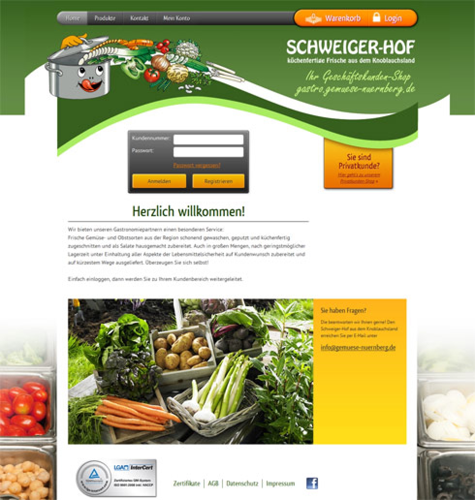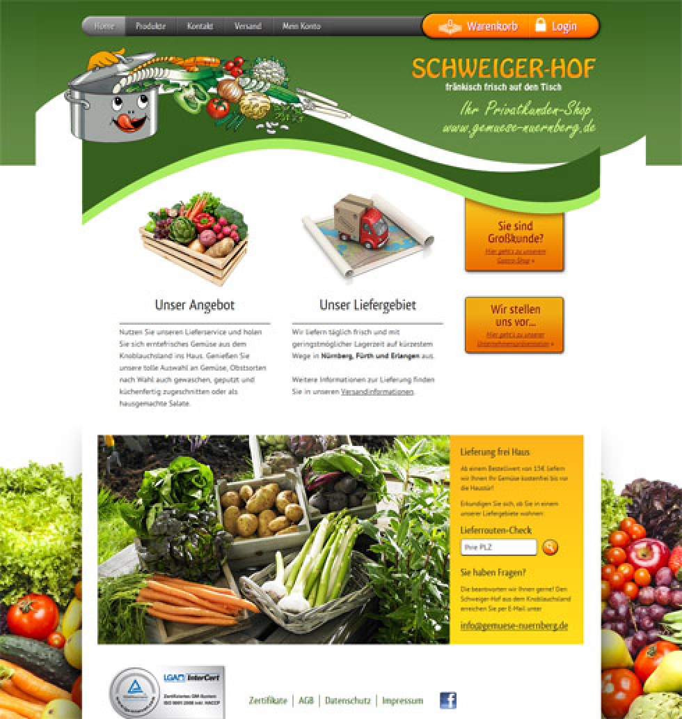 Ein weiterer, nun öffentlich unter www.gemuese-nuernberg.de zugänglicher Shop macht das umfangreiche Sortiment der Schweiger-Lehneis Obst und Gemüse GmbH nun auch für Privatkunden zugänglich. Endabnehmer können hier auf komfortable Weise aus einem großen Angebot die verschiedensten Obst- und Gemüsesorten in unterschiedlichen Verarbeitungsstufen für den Hausgebrauch bestellen. Die Lieferung erfolgt ganz bequem und ab 15 € kostenfrei an die eigene Haustür oder eine andere selbst gewählte Lieferadresse innerhalb des Liefergebiets des Schweiger-Hofs. Auch eine Selbstabholung beim Schweiger-Hof direkt vor Ort ist möglich.