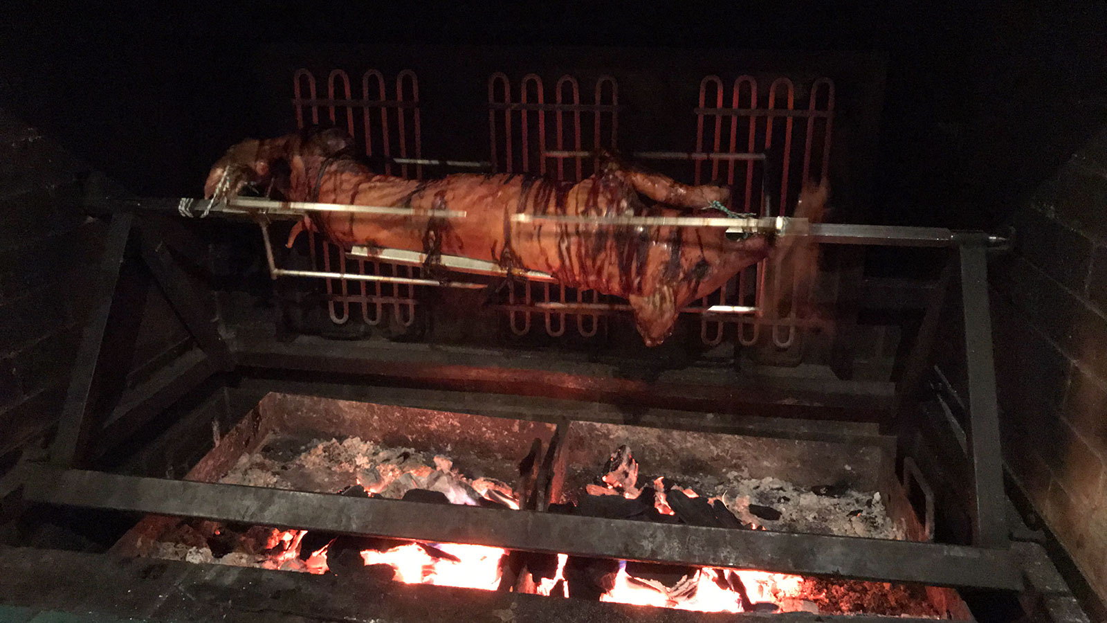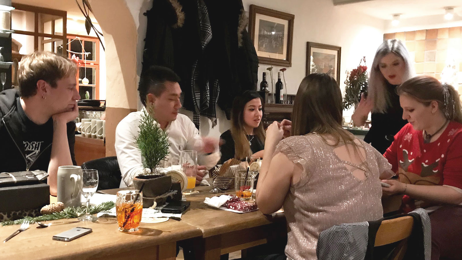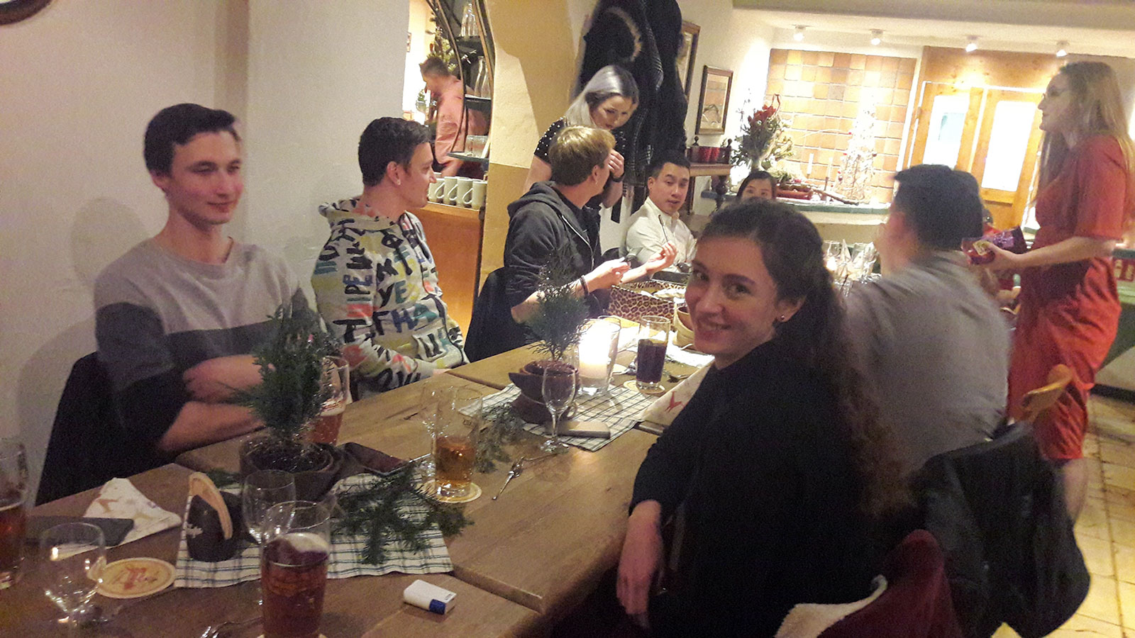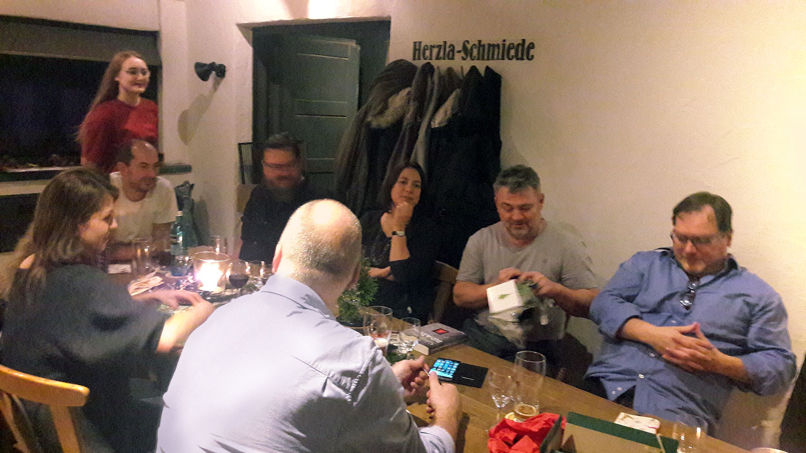 Am letzten Arbeitstag vor der Winterpause war es dann endlich soweit. Nahezu alle Kollegen folgten mit ihren Partnerinnen und Partnern gerne der Einladung. Mit 32 Personen belegten wir 2 lange Tafeln in der leicht abgetrennten „Herzla-Schmiede“, in welcher uns bereits ein munter vor sich hin drehendes Spanferkel am Spieß erwartete.