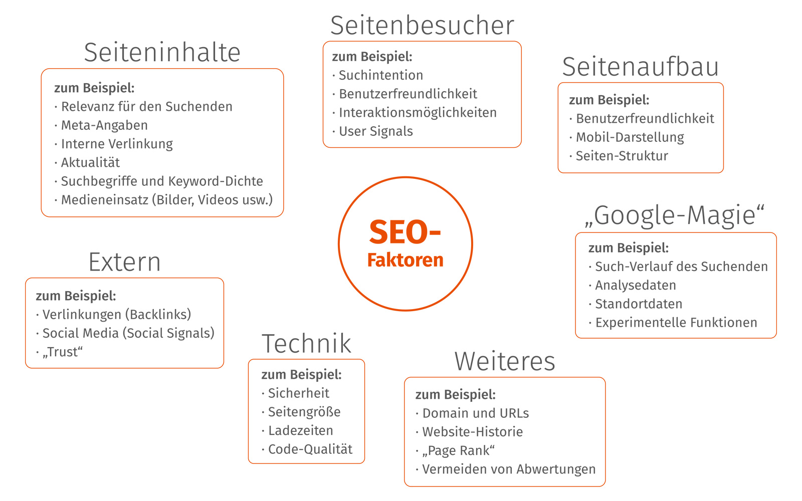Wichtige SEO-Faktoren sind unter anderem: Seiteninhalte (Überschriften, Keywords, Textlänge usw.), Meta-Angaben, Verlinkungen, Medien-Elemente (Bilder, Videos usw.) oder auch technische Aspekte wie Geschwindigkeit oder Verschlüsselung.