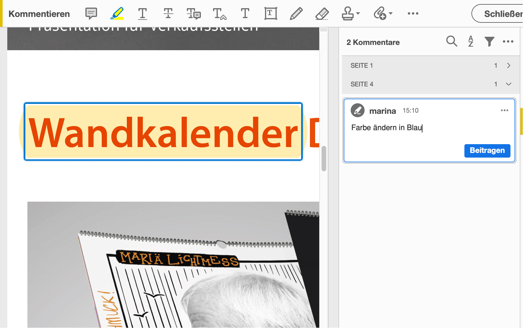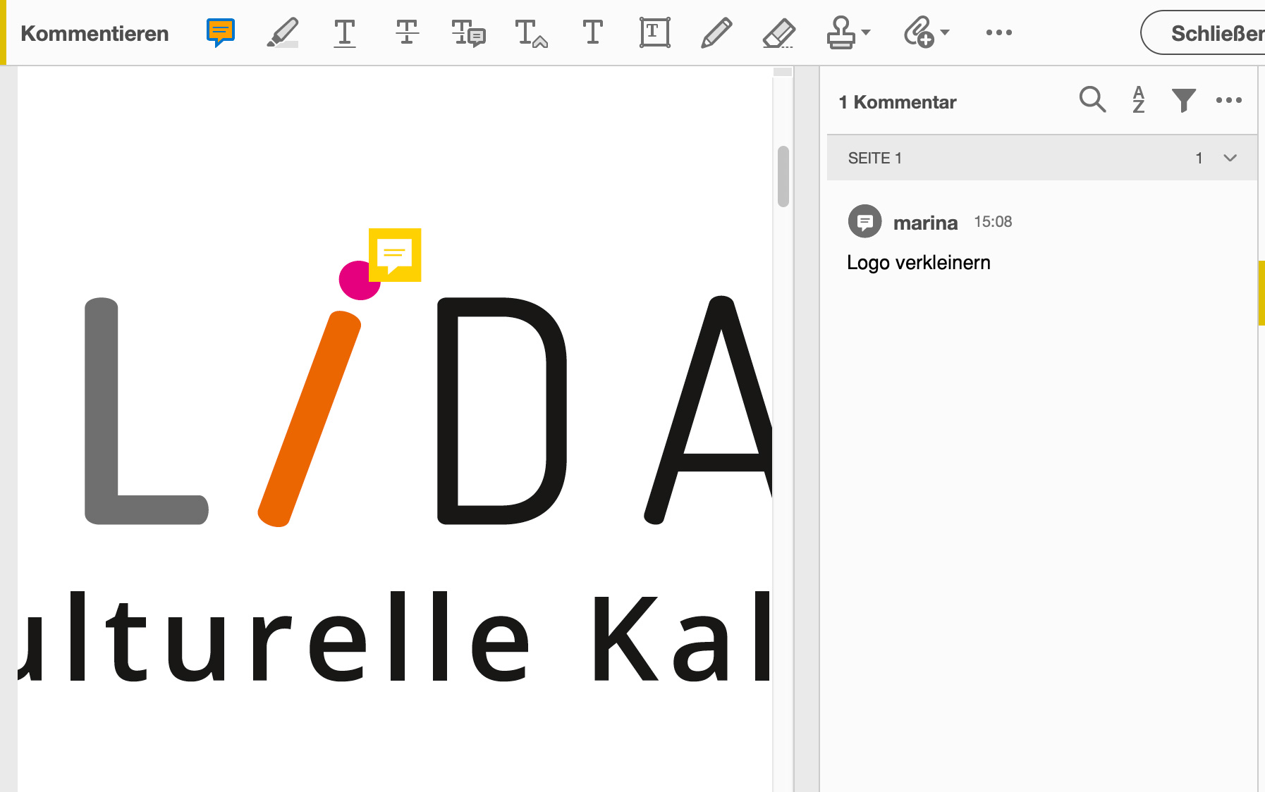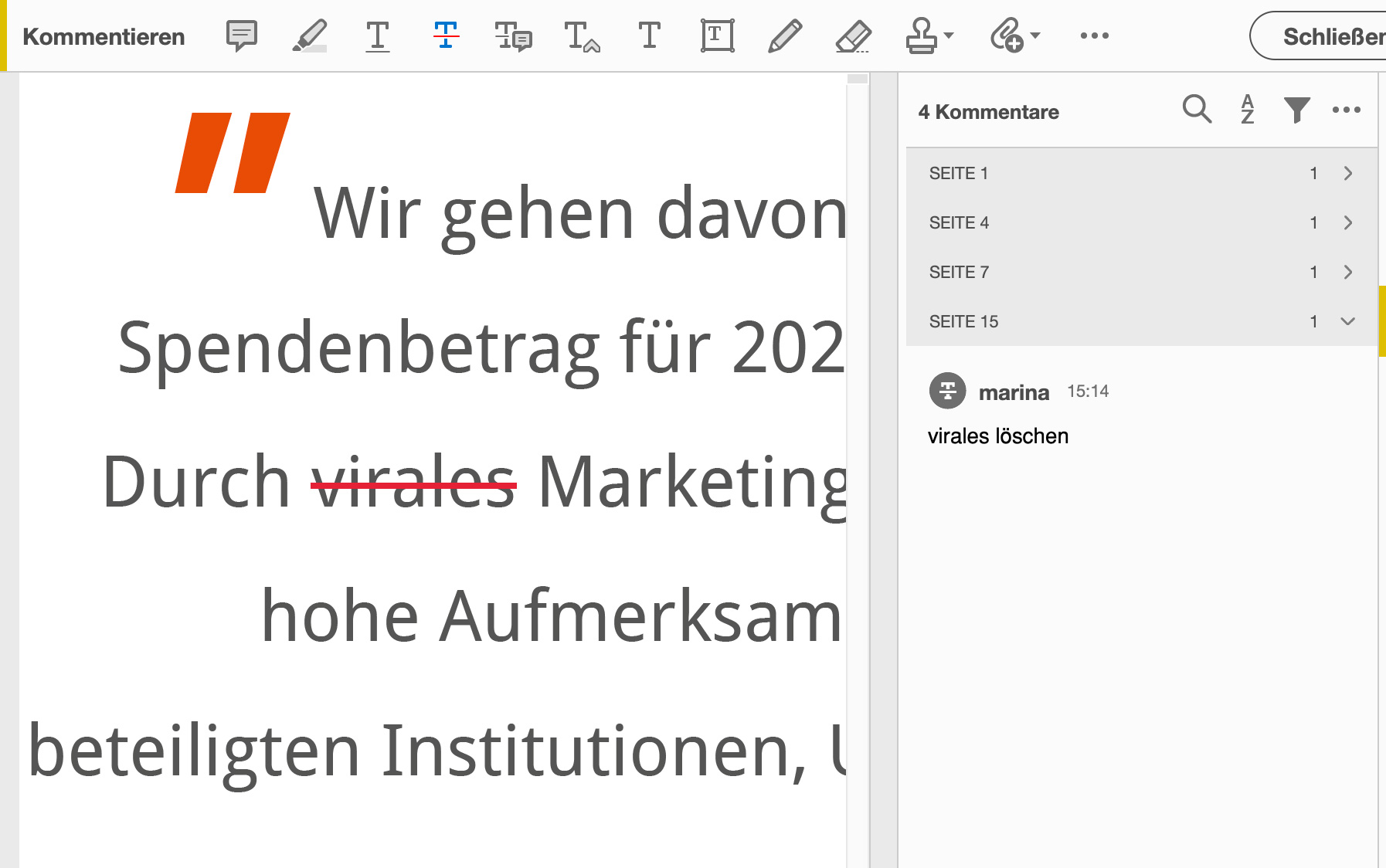 Einfacher, sicherer und ressourcenschonender ist natürlich die Nutzung der Kommentarfunktionen. Erhält der Grafiker z. B. PDF-Dateien mit neuen Texten zurück, kann er diese einfach aus dem Kommentar kopieren. Diese fügt er dann an der entsprechenden Stelle der „offenen Datei“ im Layout-Programm ein. Zur erneuten Kontrolle gibt der Grafiker wieder eine PDF-Datei aus. Bearbeitet wird das Layout aber bis zur Druckreife in der Layout-Anwendung.
