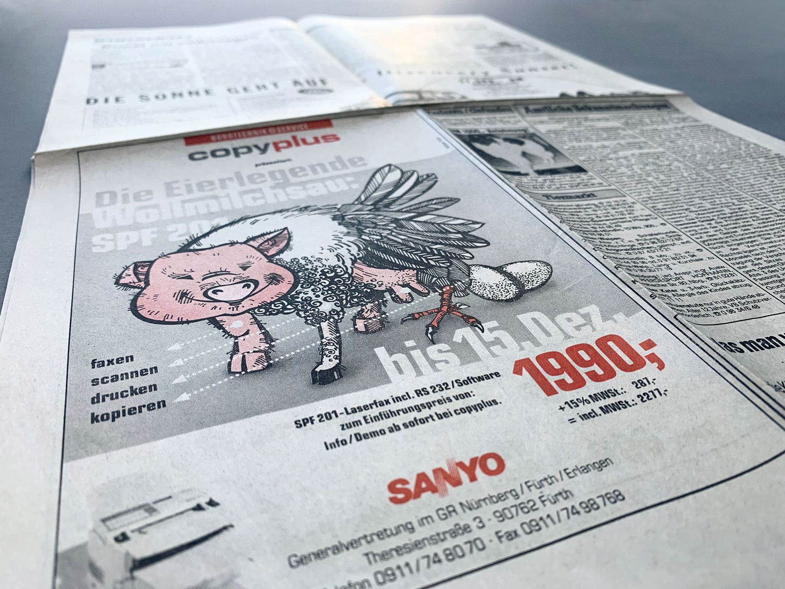 Die Hervorhebung der vielfältigen Ausdrucksmöglichkeiten der Illustration und der Gedanke an frühere Arbeitsmethoden brachten ein Motiv aus den Anfängen unseres Unternehmens in Erinnerung. Eingesetzt haben wir unsere Zeichnung u.a. für die oben abgebildete Anzeige in den Nordbayerischen Nachrichten vom 6.12.1995. Das Gerät für 1.990 DM netto war damals eine kleine technische Sensation. Es konnte faxen, scannen, drucken und kopieren. Wodurch hätte die Multifunktionalität treffender in Szene gesetzt werden können, als durch die Illustration der eierlegenden Wollmilchsau?