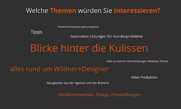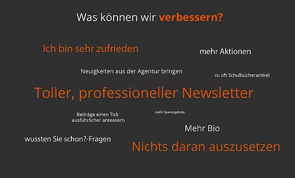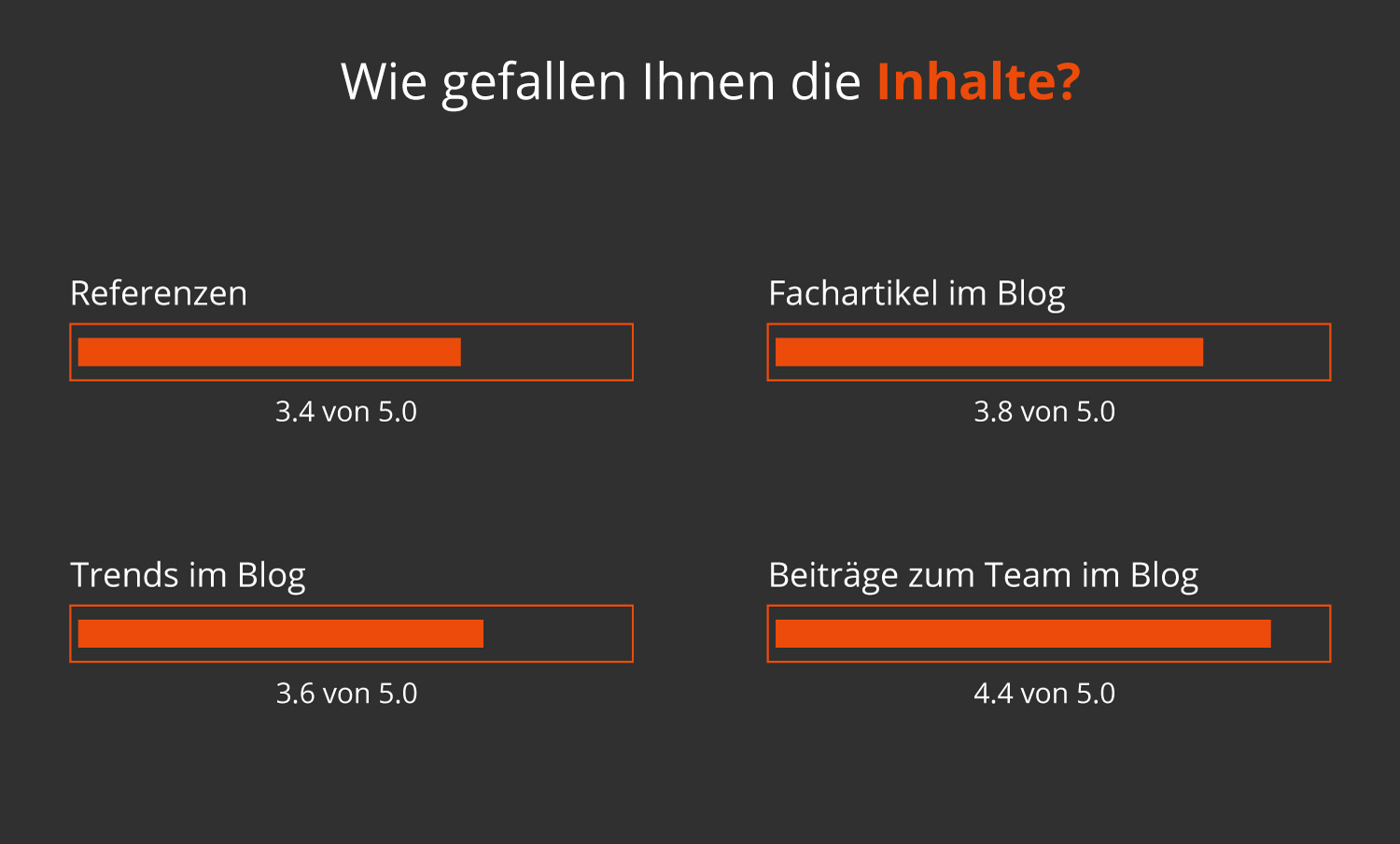 Insgesamt ergab sich ein positives Stimmungsbild, das keinen einzelnen Aspekt als negativ darstellte. Die Unterschiede in den Bewertungen bestätigten die Zugriffsstatistiken. Interessanter als die Fachbeiträge und Referenzen bewerten die Abonnenten unseres Newsletters Insights aus unserer Agentur und dem Team. Die meisten folgen den Links nur bei besonderem Interesse auf die Website und „überfliegen“ die Beiträge meist nur grob. Die folgenden Grafiken zeigen die durchschnittlichen Bewertungen und geben interessante Wünsche und Ideen wieder.
