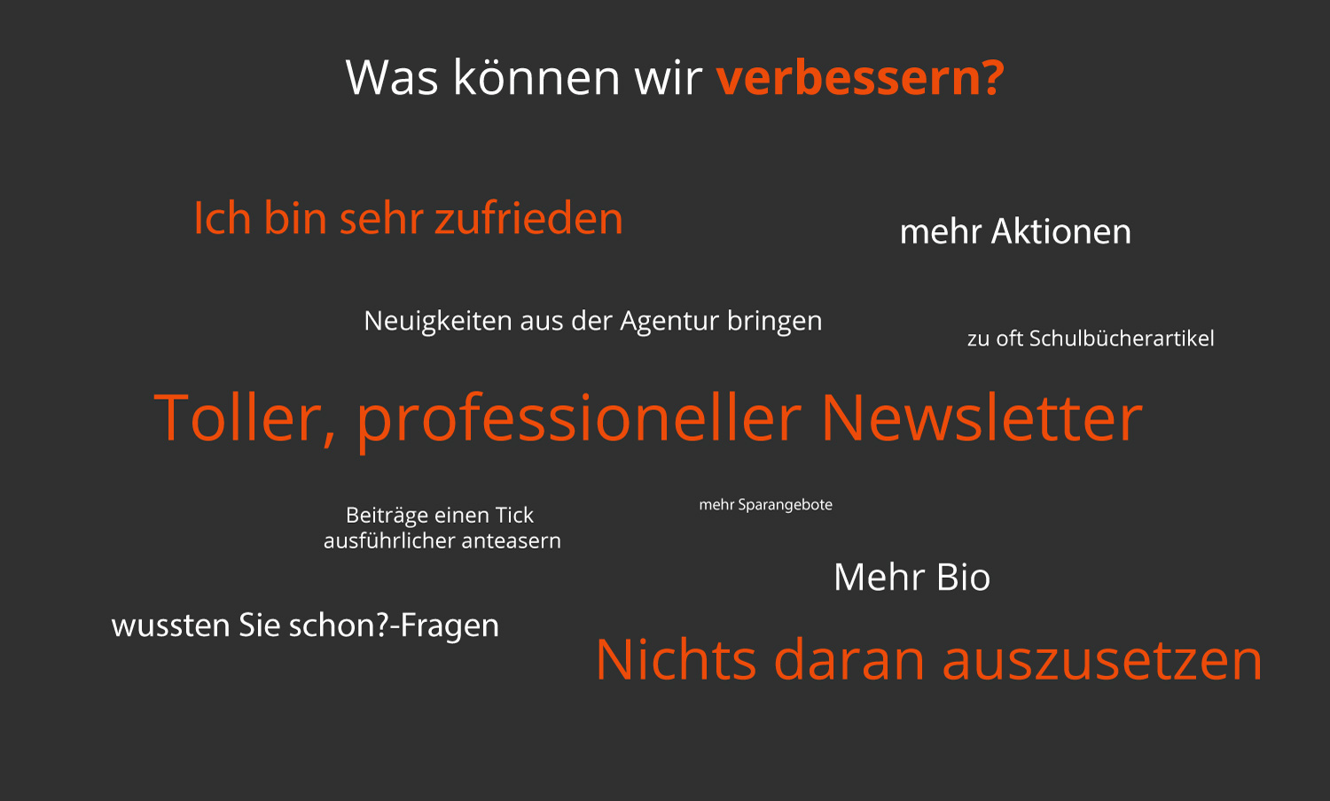 Unsere Beiträge zur Zwischenbilanz und der Bitte um Feedback veröffentlichten wir wie gewohnt auf unserer Website. Durch den Begriff „Gewinnspiel“ indizierte ein Web-Verzeichnis unseren Artikel und bewirkte eine unerwartet rege Teilnahme. Aufmerksam wurden wir darauf, als unter den Verbesserungsvorschlägen Angaben wie „Mehr Bio!“ auftauchten. Durch die Angabe der E-Mail-Adressen konnten wir diese Zufallsteilnehmer von den Newsletter-Empfängern unterscheiden.