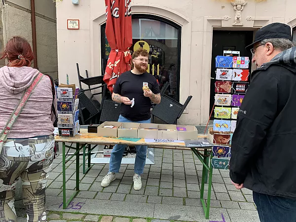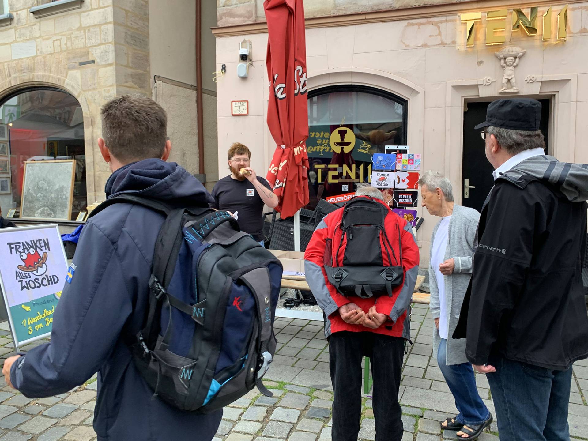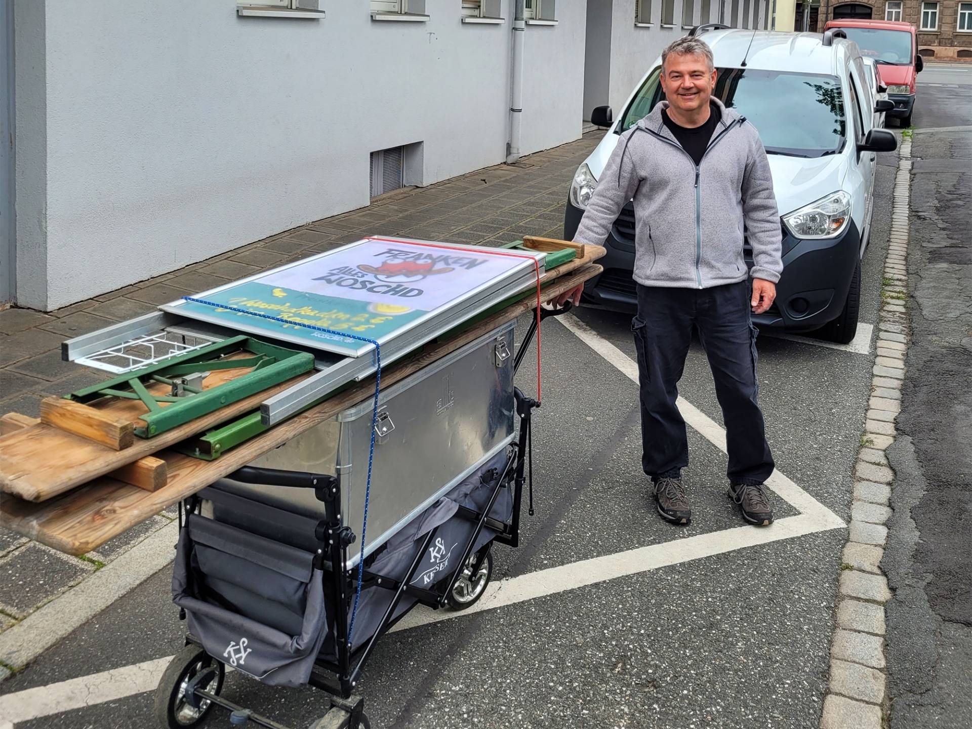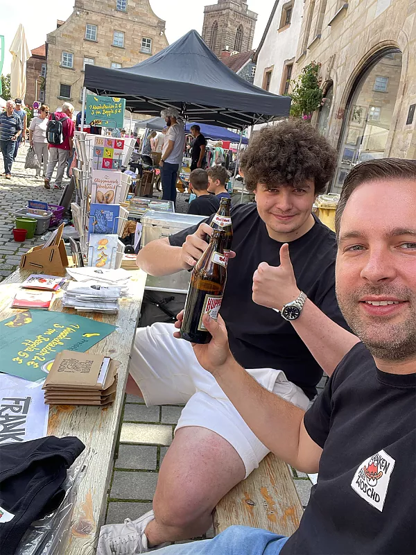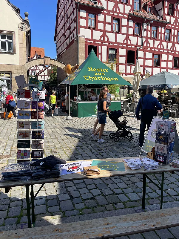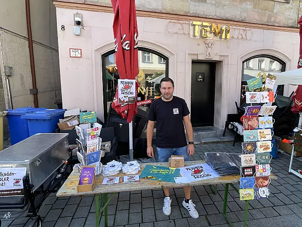 Nur wenige Meter von der „Tante Förster“ entfernt bauten wir eine Woche früher unsere Biertischgarnitur mit „Woschdkaddnständern“ auf. Denn die Gelegenheit, unser neustes Eigenprojekt den Fürthern nun auch persönlich nahebringen zu können, wollten wir nicht auslassen! Am Freitagabend standen unser Auszubildender Michael Ruckriegel und Stefan Wildner den fragenden Blicken erfolgreich Rede und Antwort. Am frühen Samstag brachte Semesterpraktikant Carsten Meeh zusammen mit Andreas Dorschner die schönen Woschdkaddn an den Graffler. Neben den Verkäufen (meist wurden „3 im Beggla“ gewünscht) ergaben sich viele neue Kontakte zu Franken-Fans und Verehrern der Bratwurst. Dazu reichten die Einnahmen vom Grafflmarkt für die Zeche und ein saftiges Trinkgeld für unsere Feier zur Jahresmitte aus.