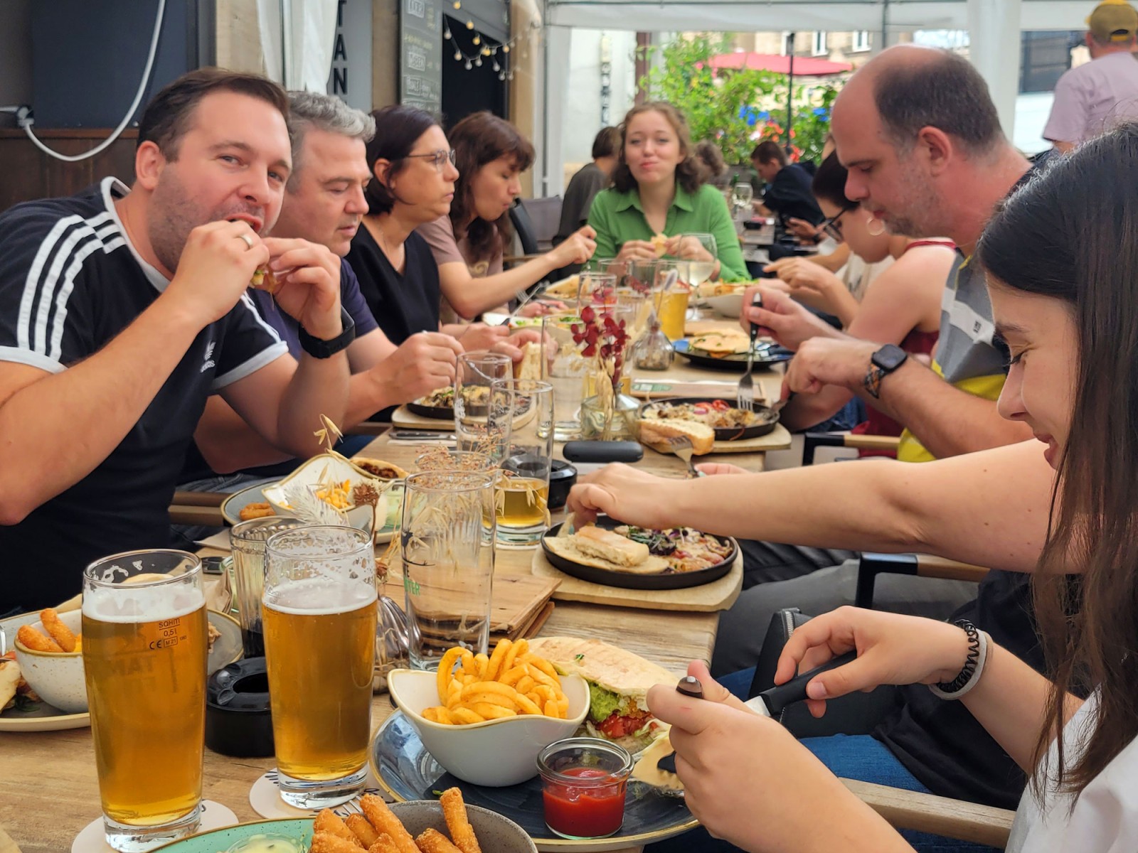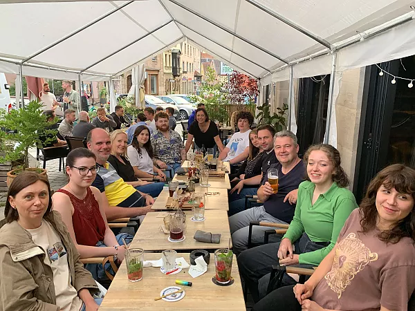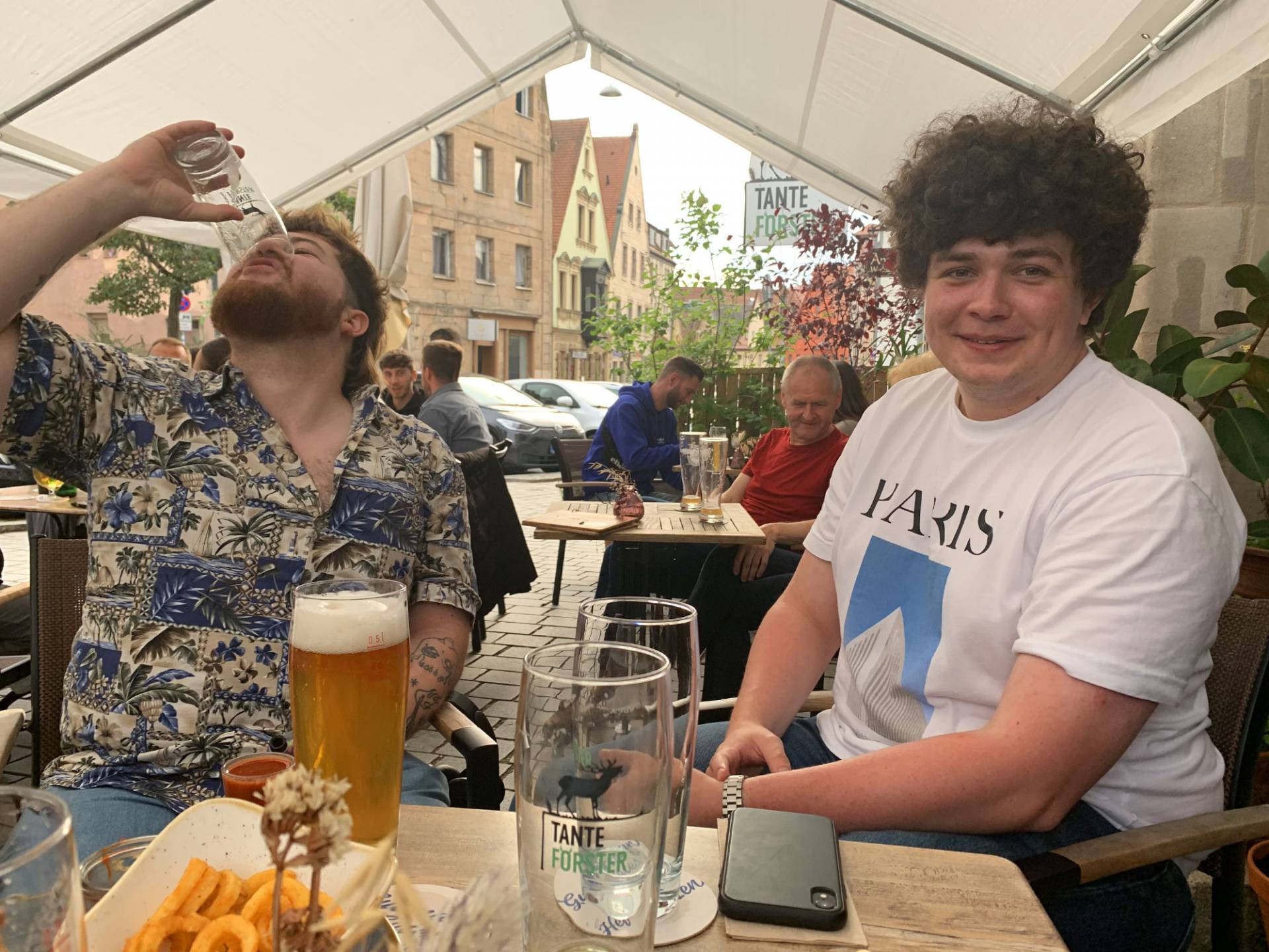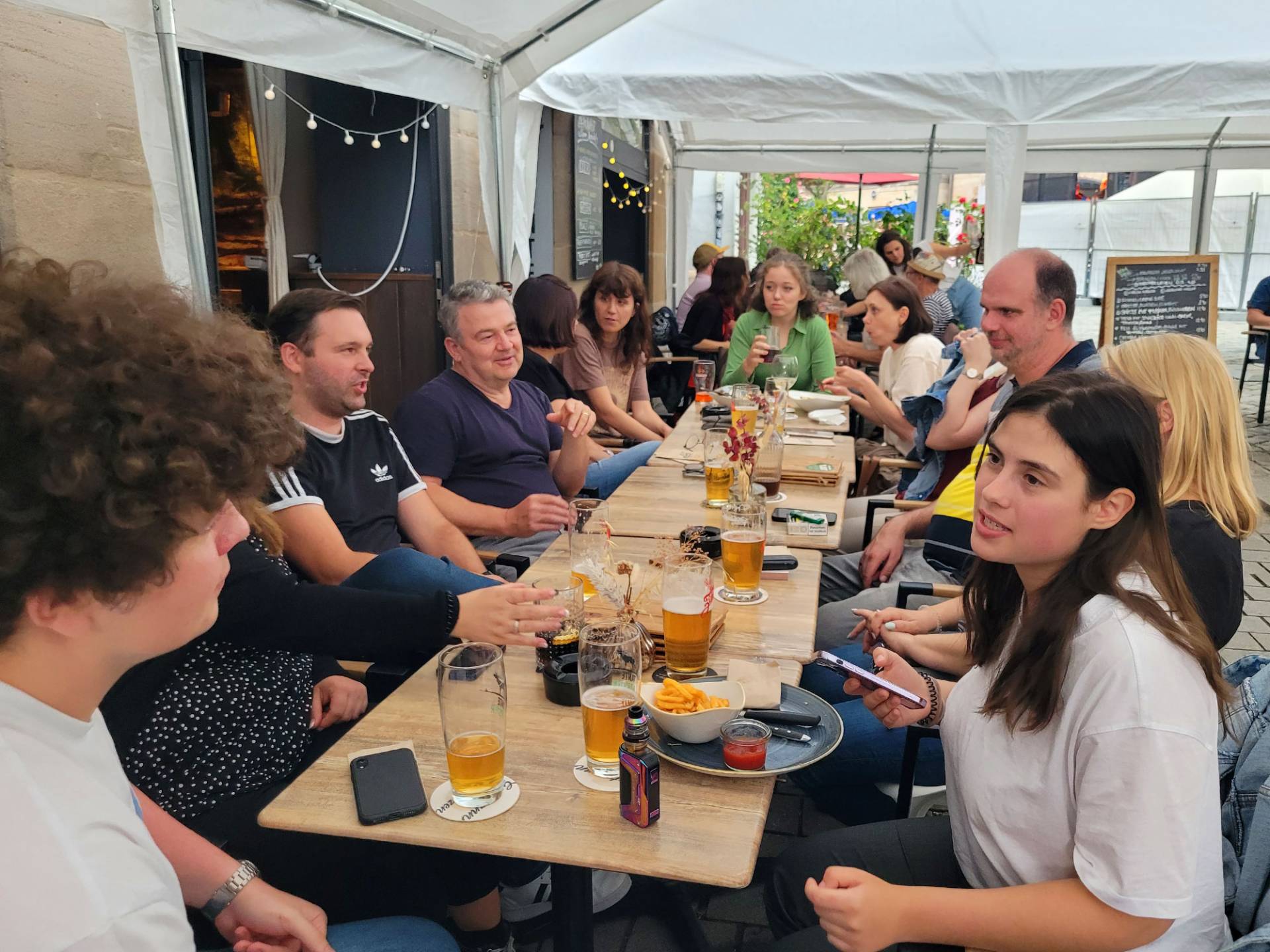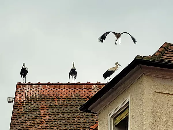 Wir fanden uns also kurz nach Dienstschluss um 18 Uhr auf der Terrasse des Lokals „Tante Förster“ ein – wie ein gutes Dutzend Störche, die auf den Dächern der umliegenden Fachwerkhäuser das rege Treiben in der stimmungsvollen Altstadt verfolgten. Beim Essen, Trinken und lockeren Austausch ließen wir uns von den Bands „The Devil's Dandy Dogs“, „Oporto“ und „Journeye“ unterhalten. Letztere begeisterte nicht nur unsere älteren Jahrgänge mit melodischen Rock-Hymnen aus den 80ern. Selbst Kollegen, die weniger Jahre als die Songs zählen, konnten mitsingen. Großes Glück hatten wir und die „Grüne Nacht“ auch mit dem Wetter. Die erwarteten Niederschläge machten brav einen Bogen um die Stadt Fürth.