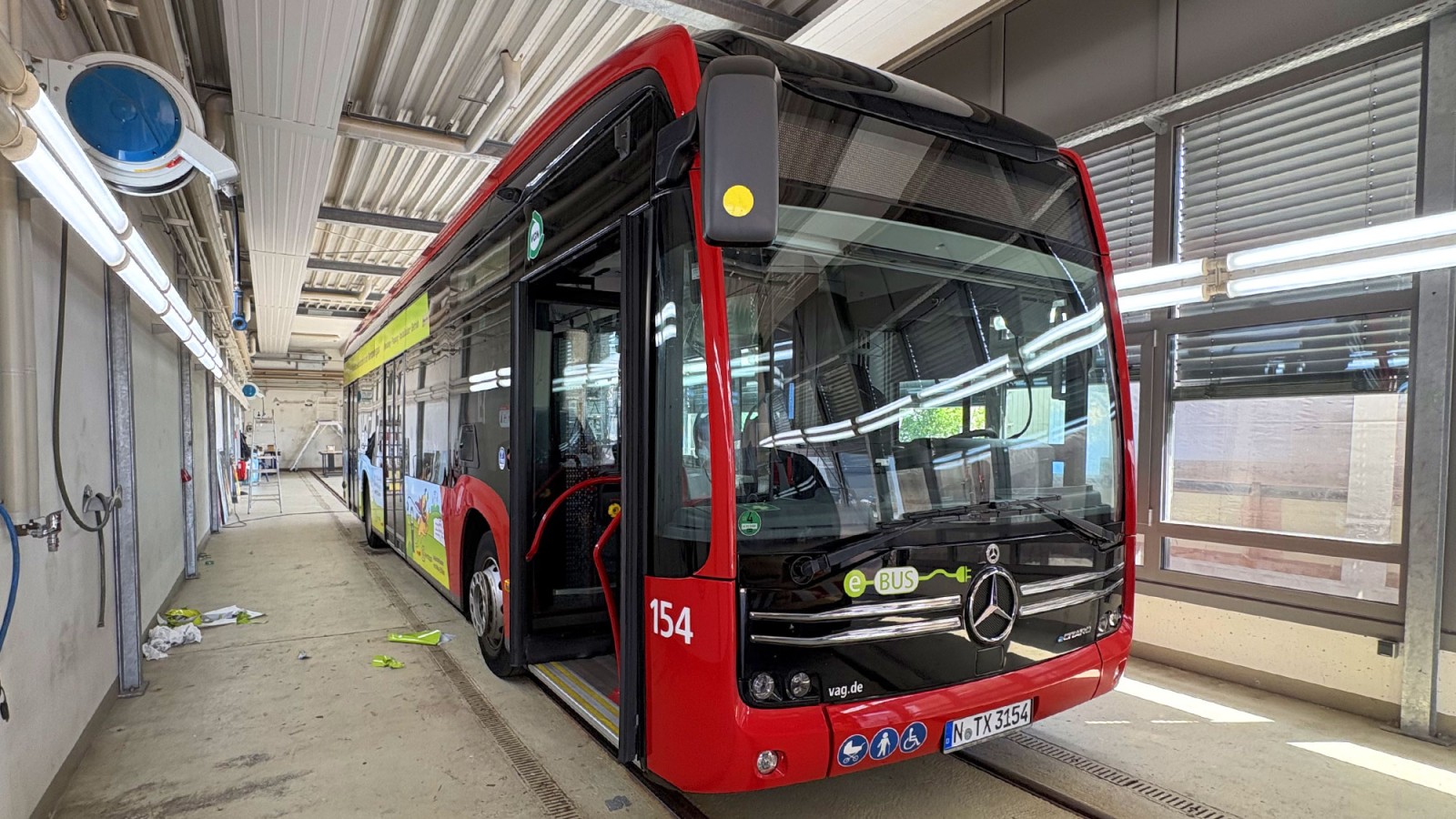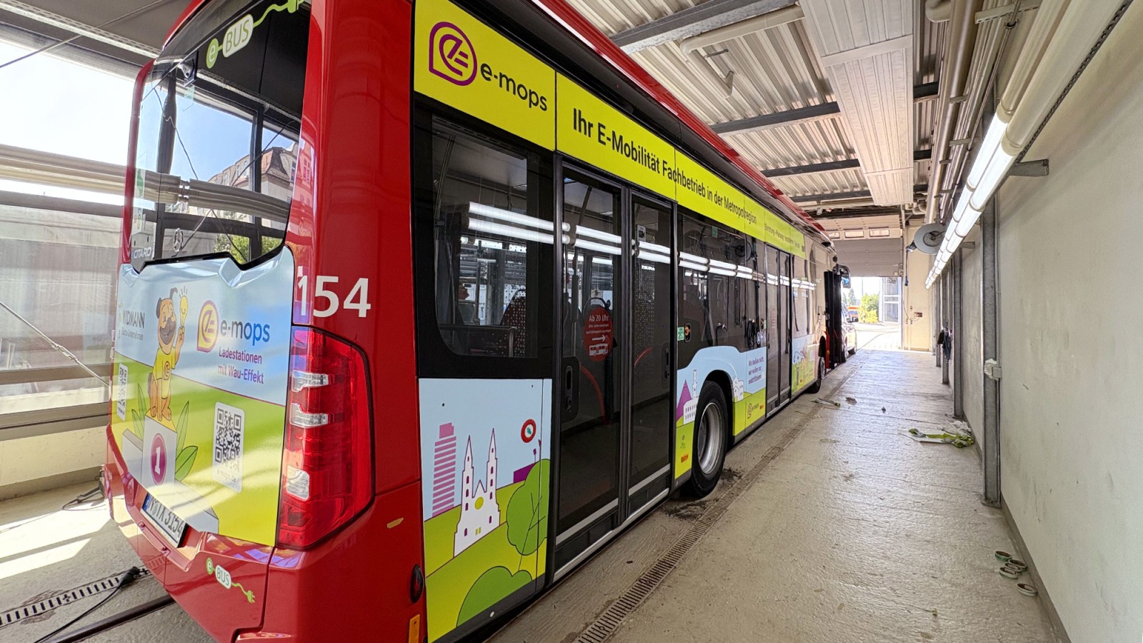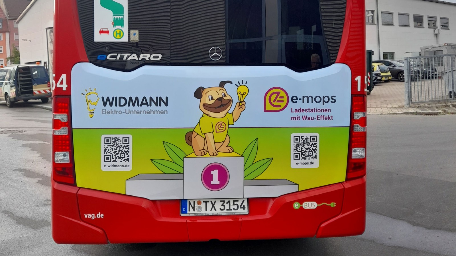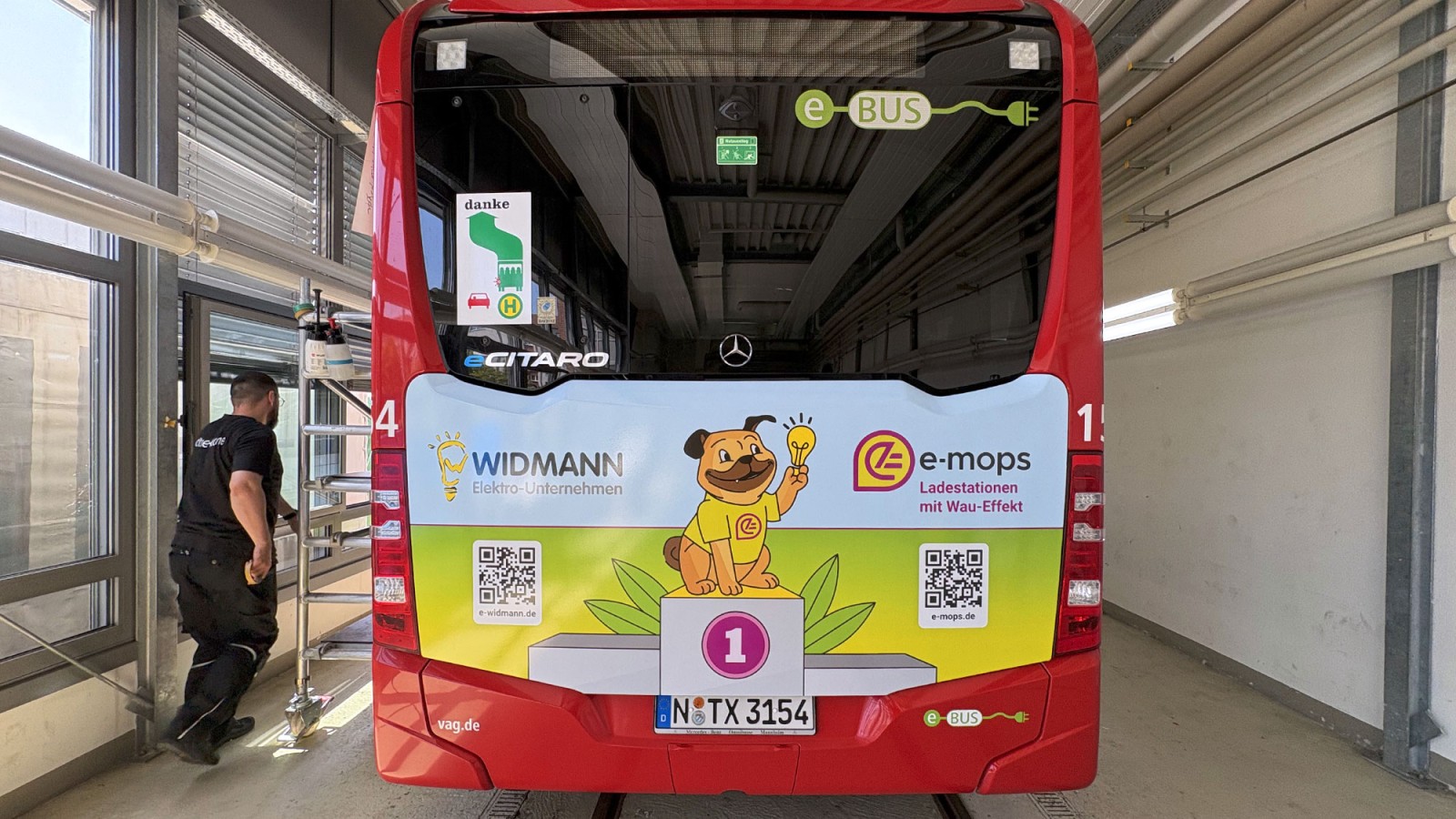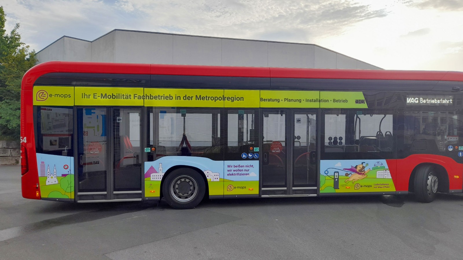 e-mops auf einem neuen e-Bus im Nürnberger Linienverkehr