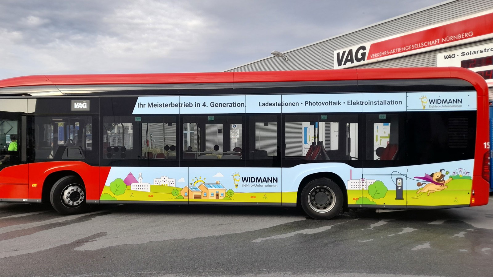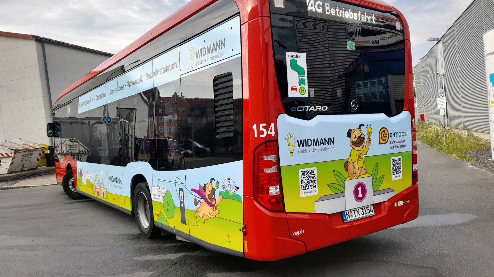 Werbung auf einem neuen E-Linienbus der VAG Nürnberg