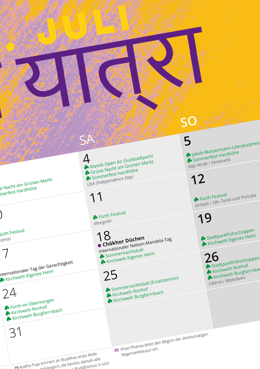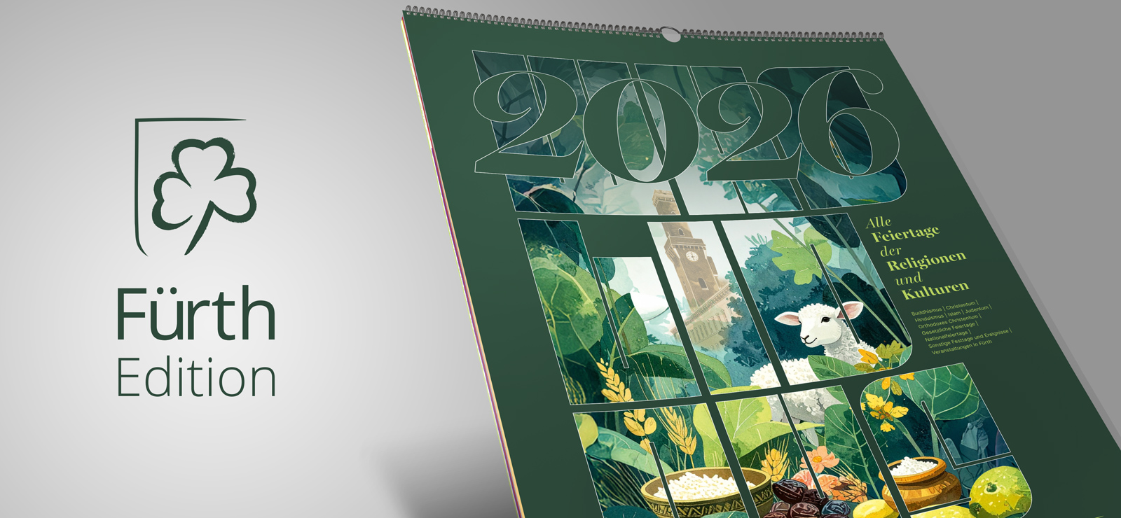 Nun entwickelten wir die Idee, zusätzlich zur überregionalen Version eine eigene „Fürth-Edition“ aufzulegen. Die interkulturellen Feste der Religionen und Kulturen werden hier durch die geplanten Veranstaltungen der Stadt Fürth in 2026 ergänzt. So können die weltoffenen Fürther alle wichtigen Termine im Auge behalten – von Makar Sakranti, dem hinduistischen Fest zur Sonnenwende, bis zum Weihnachtsmarkt auf der Fürther Freiheit.